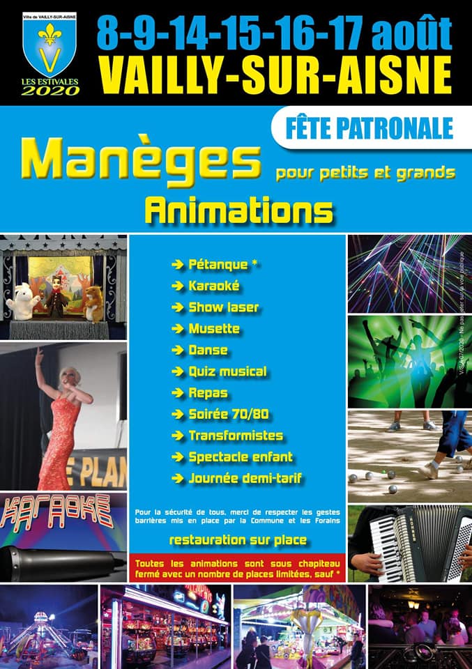 La Commission Vivre ensemble de la Ville de Vailly-sur-Aisne, malgré le contexte épidémique difficile, a fait le choix de maintenir la fête patronale. Les animations principales ont, certes, été annulées ou reportées (le feu d'artifice ou le concert d'Emile et images); pour autant les forains, intermittents et artistes ont mis sur pied un programme de dernière minute permettant de partager de bons moments en famille du 8 au 17 août.