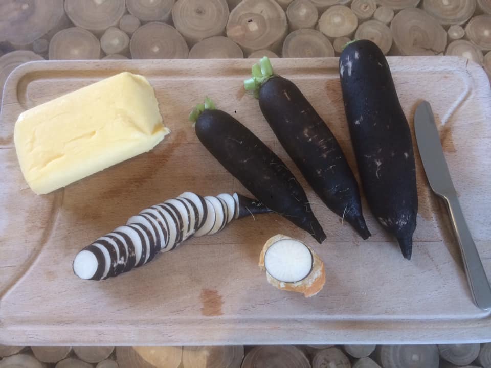 Bonjour, pour un apéritif qui change ou un début de repas, n’hésitez pas à essayer nos radis noirs! Ils sont délicieux et tellement simples à préparer! N’hésitez pas à nous demander conseil! Nous avons même le beurre demi-sel qui se marie très bien avec! Peut-être à cet après-midi ou à demain matin!