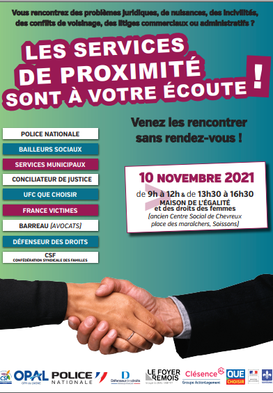 Venez à la rencontre de la police de Soissons et de ses nombreux partenaires le mercredi 10 novembre de 09H00 à 12H00 et de 13h30 à 16h30 à la Maison de l'Egalité et des droits des femmes (ancien centre social de Cheveux) - place des Maraîchers à SOISSONS.
