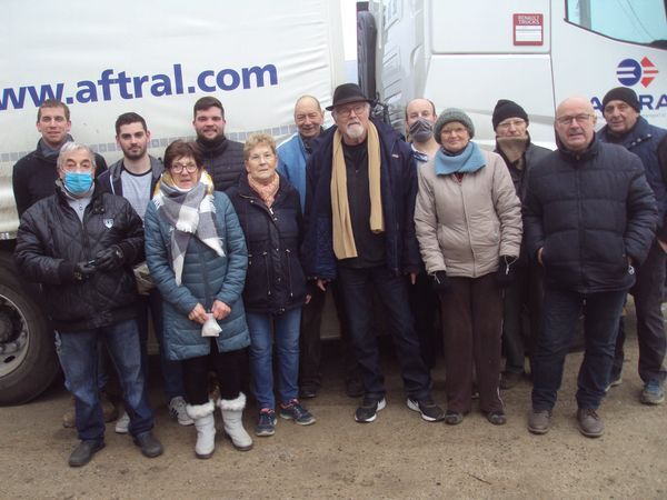 Merci aux 2 jeunes apprentis chauffeurs pour leur aide et merci à AFTRAL d'avoir effectué gracieusement ce transfert pour l'association LES BOUCHONS D'AMOUR. Merci à Alain Carlier, agriculteur à la ferme de La Guinguette de Moy de L'Aisne, d'avoir mis son hangar à notre disposition pour stocker ces nombreux sacs — avec Andre Pirson.