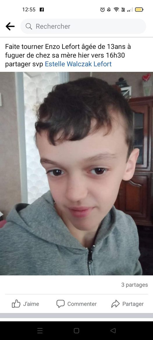 Enzo Lefort a fugué hier c est dans le 02 aidez sa famille a le retrouver svp merci