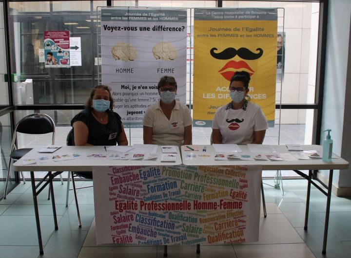 La journée d'actions pour l'égalité entre les femmes et les hommes a eu lieu jeudi 23 juin 2022 au Centre Hospitalier de Soissons. Toute la journée, des volontaires issus du groupe parité professionnelle de l'établissement, qui a piloté l'organisation de l'événement, se sont relayés pour assurer l'animation d'un stand à l'entrée du bâtiment principal. Flyers d'information sur les droits, jeu de cartes autour des stéréotypes dans le monde hospitalier comme dans la vie de tous les jours, affiches de sensibilisation ... Les moyens étaient divers, mais l'objectif restait le même : informer et sensibiliser à l'égalité professionnelle et aux droits de toutes et tous au sein de l'hôpital. La nouvelle référente égalité professionnelle du Centre Hospitalier de Soissons, Mme Bergamelli, a également pu se faire connaître des agents au cours de cette action. Cette journée a permis des échanges riches et prometteurs, qui, nous l'espérons, permettront de continuer à réfléchir ensemble à cette thématique fondamentale au sein de nos métiers hospitaliers.