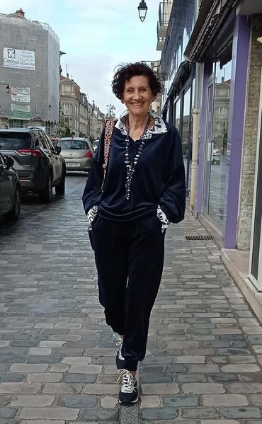 Le pyjama de jour s'affiche cette fois ci en ville ! Merci à Claudie de le porter à merveille