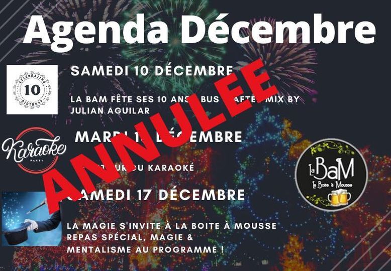 Suite au différents matchs de la Coupe du Monde 2022, nous sommes contraints d’annuler tous les événements prévus pour ce mois de Décembre