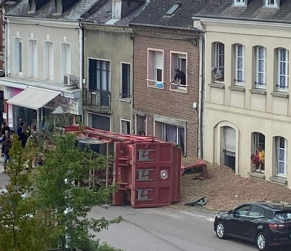 MONTCORNET : Accident est actuellement en cours sur la Place de l’Hotel de ville. Une benne de tracteur est renversée sur la chaussée et le trottoir.