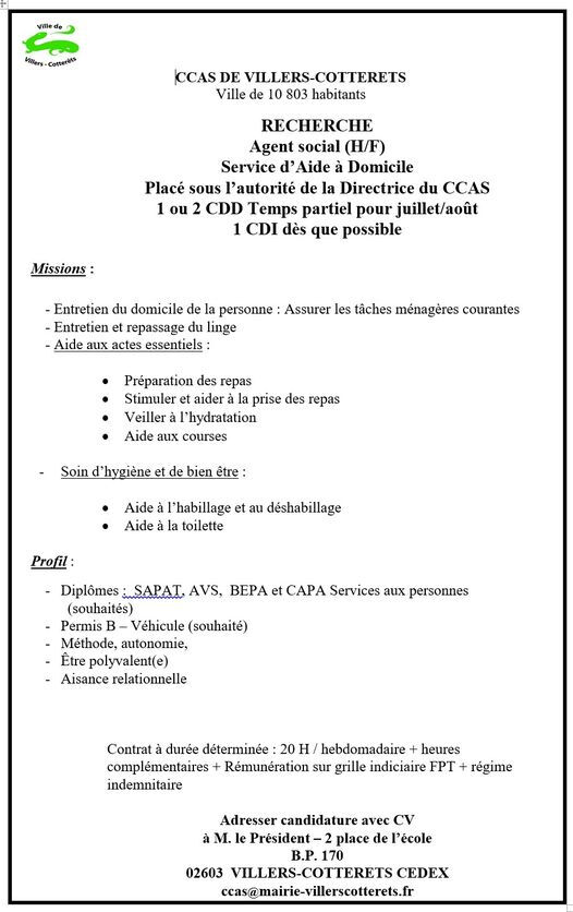 Villers-Cotterêts Le CCAS de la ville recherche un agent social (H/F)