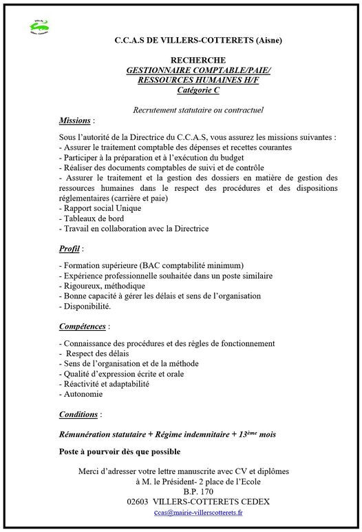 Villers-Cotterêts Recrutement au sein du Centre Communal d'action social : Gestionnaire comptable/paie/ ressources humaines