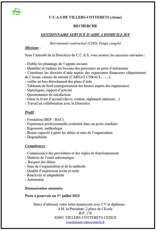 Villers-Cotterêts Recrutement au sein du Centre Communal d'action social : Gestionnaire du service d'aide à la personne