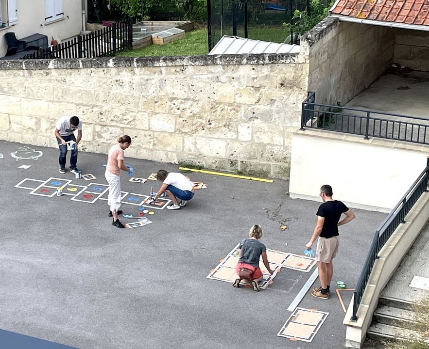 Les élus au Conseil d'école (peinture fournie par une entreprise locale )ont tenu leur engagement d'égayer les cours de l'école, aidés par les bénévoles de L' Association de Parents d'élèves de Cuisy-Pommiers-Vauxrezis : une belle surprise pour la rentrée des élèves de l'école du Limodore !!